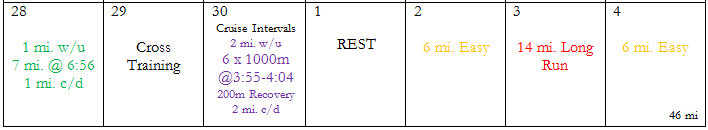 Now that all the harder workouts are done for this half, this week my focus is working out some random pains (the ball of my right foot??) and my diet.